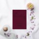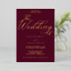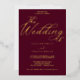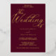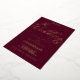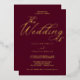 Perfecto para una celebración eterna, esta invitación a una boda de Relieve metalizado dorado tiene un rico fondo burdeos adornado con elegantes torbellinos, delicados florecientes y una exquisita tipografía de Relieve metalizado dorado con letras a mano, todo enmarcado elegantemente en un lujoso borde sellado con Relieve metalizado.