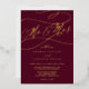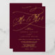 Esta romántica invitación al Relieve metalizado del Sr. y la Sra. boda, Relieve metalizado de oro, es perfecta para un simple boda. El moderno diseño clásico cuenta con elegantes remolinos y floridos extravagantes, con una preciosa y elegante tipografía de Relieve metalizado dorado con letras a mano sobre un fondo de color burdeos.