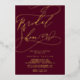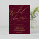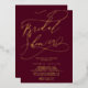 Esta romántica invitación al Relieve metalizado de Relieve metalizado dorado con ducha de novia borgoña es perfecta para una simple ducha de boda. El moderno diseño clásico cuenta con elegantes remolinos y floridos extravagantes, con una preciosa y elegante tipografía de Relieve metalizado dorado con letras a mano sobre un fondo de color burdeos.