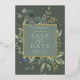Nuestra boda Eucalyptus & Sage ahorra los marcos de la cita con los detalles de tu boda con un elegante borde cuadrado de eucalipto de acuarela exuberante y hojas verdes de salvia, con un recorte real de Relieve metalizado dorado en un tono de fondo verde musgo tono.