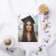 Una elegante invitación fotográfica de graduación neutral de género para celebrar a los que obtienen su título de Médica de Medicina. En la parte delantera hay una foto con fondo de sangre, con texto superpuesto, el símbolo Asclepius (con la abreviatura 'MD') y una corona de laurel, todo impreso en un color de Relieve metalizado de su elección. En la parte posterior se muestra un segundo texto, más pequeño, con fotos y plantillas para un mensaje más largo. El diseño está disponible con un símbolo caduceus, con diseños para cualificaciones específicas (RN, DO) y con diferentes diseños/orientaciones en mi tienda.