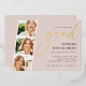 Celebra su gran hito con estas invitaciones de Relieve metalizado de moda que son perfectas para una celebración de graduación. El diseño lujoso está decorado con un elegante Relieve metalizado dorado en un amplio fondo rosa. Personalice los detalles de su fiesta alineados a la derecha con letras modernas. Termine el diseño con tres fotos cuadradas del graduado en un diseño fotográfico.