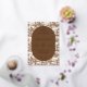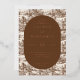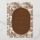 This elegant wedding invitation features a vintage-inspired design with an oval frame centered on a background of repeating pastoral illustrations in muted sepia tones. The color palette includes warm earthy hues like brown, beige, and cream, creating a rustic and nostalgic feel. The typography is classic and formal, using serif fonts that enhance the sophisticated aesthetic. Customizable elements allow for personalization, making it perfect for couples seeking a traditional yet charming look for their special day.