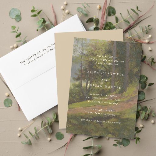 This design is part of a wedding invitation suite featuring a softly painted forest landscape with a romantic, natural feel. Inspired by serene woodland scenery, the design blends earthy tones and a gentle, painterly texture to create a warm and inviting aesthetic. Perfect for rustic celebrations, outdoor ceremonies, and destination weddings, this design evokes the beauty of nature with an understated elegance.