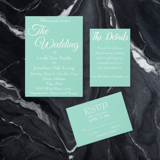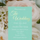 Invitación a una boda de estilo sencillo con un fondo de color marinero a la moda con "El Boda" impreso en escritura estilizada con el color de Relieve metalizado de su elección. Edite el nombre, la fecha, la ubicación, etc., con su propia información impresa en letras blancas. Diseñado para coordinar con nuestra colección de Bodas Seafoam Simple Style.