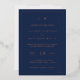Invitación a la boda simple con un diseño moderno y elegante con su monograma de dos letras en la parte superior, un diseño de fecha audaz y sus detalles rodeados de un borde delgado. Todos los elementos de diseño del frente están impresos con un Relieve metalizado de oro rosa real sobre un fondo azul marino. Una moda y elegante Invitación a la Boda que es ideal para una pareja minimalista.