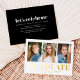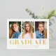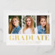 Elegante invitación a una fiesta de graduación con 3 fotos enmarcadas en blanco con "Graduado" en negrita, con letras en Relieve metalizado dorado. Personalice la invitación de la parte delantera de la fiesta de graduación de Relieve metalizado con el nombre del graduado, el nombre de la escuela y el año de graduación. La parte posterior de la invitación muestra los detalles de su fiesta de graduación debajo de la frase "celebremos" con un sólido fondo negro.