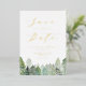 Este personalizable guarda la tarjeta de fecha con un bosque de nieve de siempre verde y un texto de Relieve metalizado brillante en la parte delantera. Elija entre oro, oro rosa o Relieve metalizado plateado para un acabado pulido y llamativo. El diseño, inspirado en la naturaleza, es perfecto para bodas de invierno o rústicos. Personalízalo con sus nombres y fecha de boda para enviar una invitación elegante.