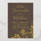 Este diseño presenta peonías de Relieve metalizado de oro y follaje en un estilo de dibujo moderno y mínimo. El tipo de letra del Relieve metalizado dorado correspondiente incluye serifs clásicos y una tipografía cursiva manuscrita. En la parte trasera también encontrarás los detalles de la recepción, con mucho espacio para añadir textos adicionales. Nota: El texto de la parte posterior de la invitación no se ha frustrado.