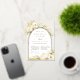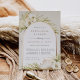 Las invitaciones a los ensayos de moda tropical en una atractiva paleta de color neutro cuentan con un arco de Relieve metalizado de oro rosa que lleva los detalles del ensayo de la ceremonia y de la cena, acentuado con frondas de palma de color verde claro, follaje de isla de playa, orquídeas blancas, botánicos secos en boho y pasto de pampas.
