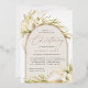 El bautismo de moda tropical o el bautizo de invitaciones en una atractiva paleta de color neutro cuentan con un arco de Relieve metalizado oro rosa que lleva su ceremonia de la iglesia y celebración o detalles fiestas, acentuados con frondas de palmera de color verde claro, follaje de la isla de la playa, orquídeas blancas, botánicos secos y pasto de pampas.