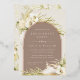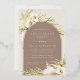 Las invitaciones a la fiesta de compromiso de la moda tropical en una atractiva paleta de color neutro cuentan con un arco de Relieve metalizado dorado subió con los detalles de la fiesta de compromiso, acentuado con frondas de palma de color verde pálido, follaje de la isla de la playa, orquídeas blancas, botánicos secos en boho y pasto de pampas.