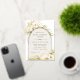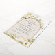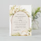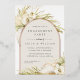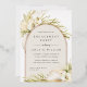Las invitaciones a la fiesta de compromiso de la moda tropical en una atractiva paleta de color neutro cuentan con un arco de Relieve metalizado dorado subió con los detalles de la fiesta de compromiso, acentuado con frondas de palma de color verde pálido, follaje de la isla de la playa, orquídeas blancas, botánicos secos en boho y pasto de pampas.