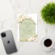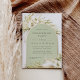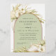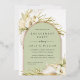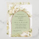 Las invitaciones a la fiesta de compromiso de la moda tropical en una atractiva paleta de color neutro cuentan con un arco de Relieve metalizado dorado subió con los detalles de la fiesta de compromiso, acentuado con frondas de palma de color verde pálido, follaje de la isla de la playa, orquídeas blancas, botánicos secos en boho y pasto de pampas.