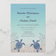 Dos tortugas de plata sobre un fondo de playa de arena turquesa con hojas tropicales. Elegante carta de invitación a la boda en la playa. Con un texto de detalles al fondo.