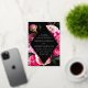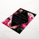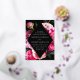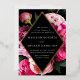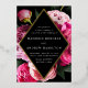Elegantes invitaciones florales para bodas con detalles de boda dentro de un marco de diamante de Relieve metalizado dorado con fondo negro. Hermosas peonías rosadas vírgenes y rosadas con hojas verdes exuberantes. Las invitaciones de Relieve metalizado dorado y bodas peones se revertirán a un fondo negro con espacio para texto e imágenes adicionales.