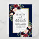 Moderno y elegante acuarela Borgoña Blue Floral Wedding Invitation incluye rosas de Borgoña, rosas rosas rosas, flores azules, flores rojas, hojas de eucalipto y vegetación botánica. Marco de Relieve metalizado dorado. Fondo Azul. Foto de vuelta.