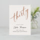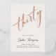 A white and rose gold, glam, modern, elegant and chic 30th birthday party invitation template featuring the word "thirty" covered in real rose gold foil, modern calligraphy script and typography in charcoal black. A chic, modern minimalist design for a woman on her thirtieth birthday.