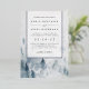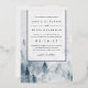 Elegante invitación a bodas de invierno con un fondo de acuarela que representa un paisaje montañoso nevado salpicado de pinos en tonos brumosos de azul y gris. Personalice los detalles de su boda en moda con letras blandas de color negro, acentuadas con guarnecido de Relieve metalizado plateado. Una hermosa elección para elegantes bodas de invierno en ambientes montañosos o forestales.