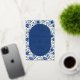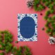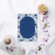 This elegant foil invitation features a classic blue and white color palette, creating a timeless and sophisticated look. The design showcases intricate floral motifs surrounding the central text area, which is framed in a deep navy oval. The typography is clean and modern, with customizable fields for personal details, making it perfect for weddings or formal events. The overall mood is refined and romantic, ideal for celebrating life's special moments.