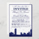 ¡Una toma muy moderna y caprichosa de tu evento de etiqueta! La silueta de Boston personaliza la invitación perfecta para la fiesta. ¡Más siluetas urbanas en camino! Tarjetas de RSVP a juego disponibles. Fondo blanco con azul oscuro/marina