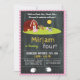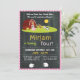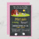 Invitación de cumpleaños de granja impresa en una granja con animales delante de una casa de campo limitada por una cerca en un fondo de pizarra.