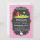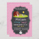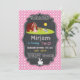 Invitación de cumpleaños de granja impresa en una granja con animales delante de una casa de campo limitada por una cerca en un fondo de pizarra.