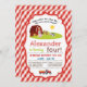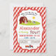Invitación de cumpleaños de granja impresa en una granja con animales delante de una casa de campo rodeada por una cerca.