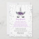 Hermosa invitación con la cara de un unicornio en tonos morados y con falsos brillos metalizados. Visita nuestra página para ver diseños similares.