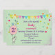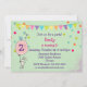 Una invitación de cumpleaños con un lindo conejito sosteniendo un globo. Un pequeño birdie se sienta encima del globo silbando una melodía. Un banner de cumpleaños y un confetti multicolor decoran este diseño.