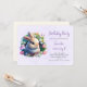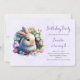 Una invitación de cumpleaños con una adorable ilustración. Un pequeño conejito marrón y blanco. Rodeado de hermosas flores de primavera.
