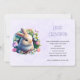 Invitación de Pascua con una adorable ilustración. Un pequeño conejito marrón y blanco. Rodeado de hermosas flores de primavera.