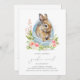 Una invitación para revelar el género del bebé de Pascua y primavera. El diseño acuático incluye un bonito conejo surgiendo de un huevo rodeado de flores rosas y follaje. Personalice editando con sus detalles.
