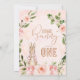 Conejo de conejo conejo conejo con flores rosadas Invitación al primer cumpleaños Dulce algunos conejitos se están convirtiendo en una invitación de primer cumpleaños con un conejo conejo usando una chaqueta rosa y una corona floral. El diseño también incluye algunas imágenes falsas de texto purpurina de oro que pueden extraerse. Este es un diseño dulce para una pequeña fiesta de cumpleaños con tema de conejo o conejo.