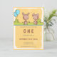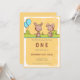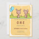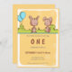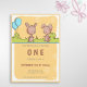 Adorable invitación amarilla de primer cumpleaños con algunos pequeños conejitos. La invitación tiene un rectángulo amarillo como color de fondo con algunas flores blancas. En la parte superior, los pequeños conejos marrones se enfrentan unos a otros en el bosque. Un par de globos azules brillantes están saliendo de algunos arbustos. Debajo del ilustracion encontrará toda la información que necesita cambiar para personalizarlo en tonos marrones y grises. Puede pulsar sobre el personalizar y cambiar estos colores, el tipo de letra y el tamaño. Ilustrado y diseñado por Patricia Álvarez.