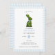 Invitación de cumpleaños para niños con conejo de topiaria pintado a mano en acuarela y borde de cuadros azules y blancos.