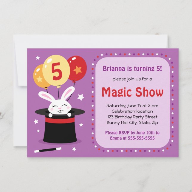 Invitación mágica linda y de la diversión de la demostración de cumpleaños de la fiesta que ofrece un pequeño conejo en un gorra de los magos. Detrás de son los globos con las estrellas y edad adaptable.