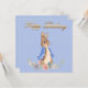 Conejo Pedro sobre fondo azul con texto "Feliz cumpleaños" en oro.