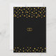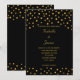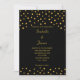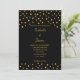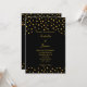 Confeti metálico dorado elegante en Invitación de Boda negra. La parte posterior tiene dos anillos dorados sobre fondo negro. Tarjetas de invitación de boda doradas negras elegantes.