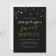 Modernas invitaciones dulces para fiestas de 16 años que incluyen confetti de la estrella del Relieve metalizado de oro falso y tipografía elegante en un fondo negro. Con una combinación de caligrafía de moda y fuente serif que muestra "Sweet Sixteen". Esta invitación se revierte a un fondo negro con un patrón estrella de oro. Usted puede fácilmente personalizar el color de fondo para satisfacer sus necesidades.