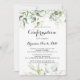 Esta elegante invitación de confirmación de caligrafía dorada es perfecta para un simple evento religioso. El diseño presenta oro de mano y hojas de eucalipto botánico verde, inspiradoras de belleza artística.