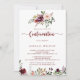 Esta rústica invitación a confirmación de caligrafía floral de verano es perfecta para un sencillo evento religioso. El diseño se compone de flores de color burdeos, rosa y azul con hojas verdes en un fondo manchado de color marrón.