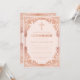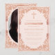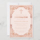 Esta elegante invitación de confirmación en rosa oro y rosa claro con un aire vintage, recomendada para una niña, tiene un marco de lámina de rosa oro (falso) ornamentado con decoraciones barrocas elegantes sobre un fondo rosa claro. Sobre el texto hay una cruz religiosa en rosa oro. Excepto la ocasión "Confirmación", que también está en rosa oro, todo el texto se puede personalizar y tiene un color similar al marco de rosa oro. En el reverso, tiene un marcador de posición ovalado para una foto de niña dentro del mismo marco.