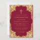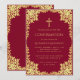 Esta elegante invitación de confirmación de color burgundy y dorado con un aire vintage, recomendada para una niña, tiene un marco de lámina de oro falso ornamentado con ramas serpenteantes con hojas doradas sobre un fondo burgundy. Sobre el texto hay una cruz religiosa en lámina de oro falso. Todo el texto se puede personalizar y tiene un color amarillo dorado similar al marco de oro falso.