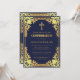 Esta elegante invitación de confirmación azul marino y dorado con aire vintage, recomendada para un niño, tiene un marco de falso foil dorado ornamentado con decoraciones barrocas elegantes sobre un fondo azul marino. Sobre el texto hay una cruz religiosa en falso foil dorado. Excepto la ocasión "Confirmación", que también está en falso dorado, todo el texto se puede personalizar y tiene un color amarillo dorado similar al marco de falso dorado.