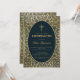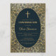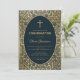 Esta elegante invitación de confirmación con aire vintage tiene un marco dorado vintage con motivos de hojas de oro en espiral sobre un fondo azul marino oscuro. El texto está dentro de un oval con un borde dorado y tiene una cruz de oro encima. El nombre del niño está escrito en un elegante guión caligráfico. Todo el texto puede ser personalizado y tiene un color dorado similar a las decoraciones doradas del marco. En la parte posterior, hay una decoración con las mismas hojas de oro y un óvalo más pequeño con una cruz de oro en el centro. El fondo con sus elegantes decoraciones de hojas de oro en azul marino es de un encuadernador de libros vintage, de T. J. Cobden-Sanderson (1840-1922), para The Capital de Karl Marx; publicado en 1884, ahora de dominio público. El libro pertenecía al artista William Morris.