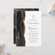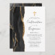 El borde izquierdo de esta elegante y moderna invitación a la Confirmación incluye un borde de batida de color negro adornado con un falso purpurina de oro. Una falsa cruz de Relieve metalizado dorado aparece encima del texto del personalizable, que combina escritura a mano, copperplate y tipografías cursivas en gris carbón sobre un fondo blanco. El reverso presenta un diseño de agate negro y oro a juego.
