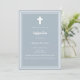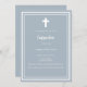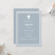 Fondo azul turbio, decorado con un marco blanco y una cruz blanca Personaliza y añade el nombre y los detalles. Texto blanco.