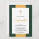 Elegante invitación de confirmación dorada y verde. Diseño con cruz fría y guión de "confirmación" en el moderno marco y borde dorado. Perfecto para la confirmación de niño.