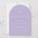 Una invitación de confirmación simple, moderna en forma de arco, neutral en género. Sólo tiene texto blanco sobre fondo de lavanda (púrpura claro). En la parte superior hay una cruz con texto en arco encima de ella. La ocasión y el nombre están escritos en guión.